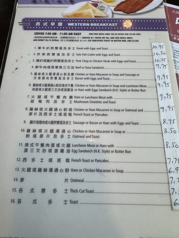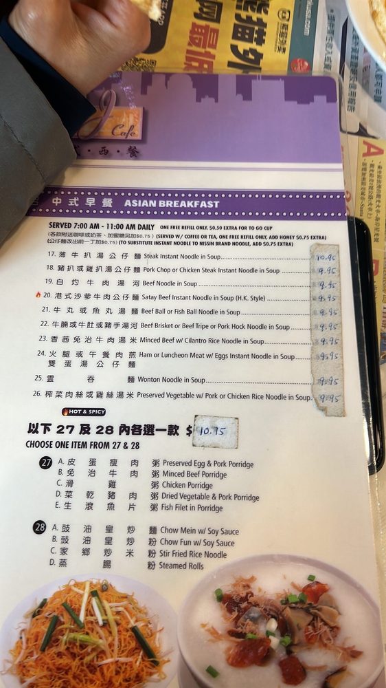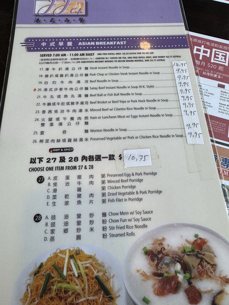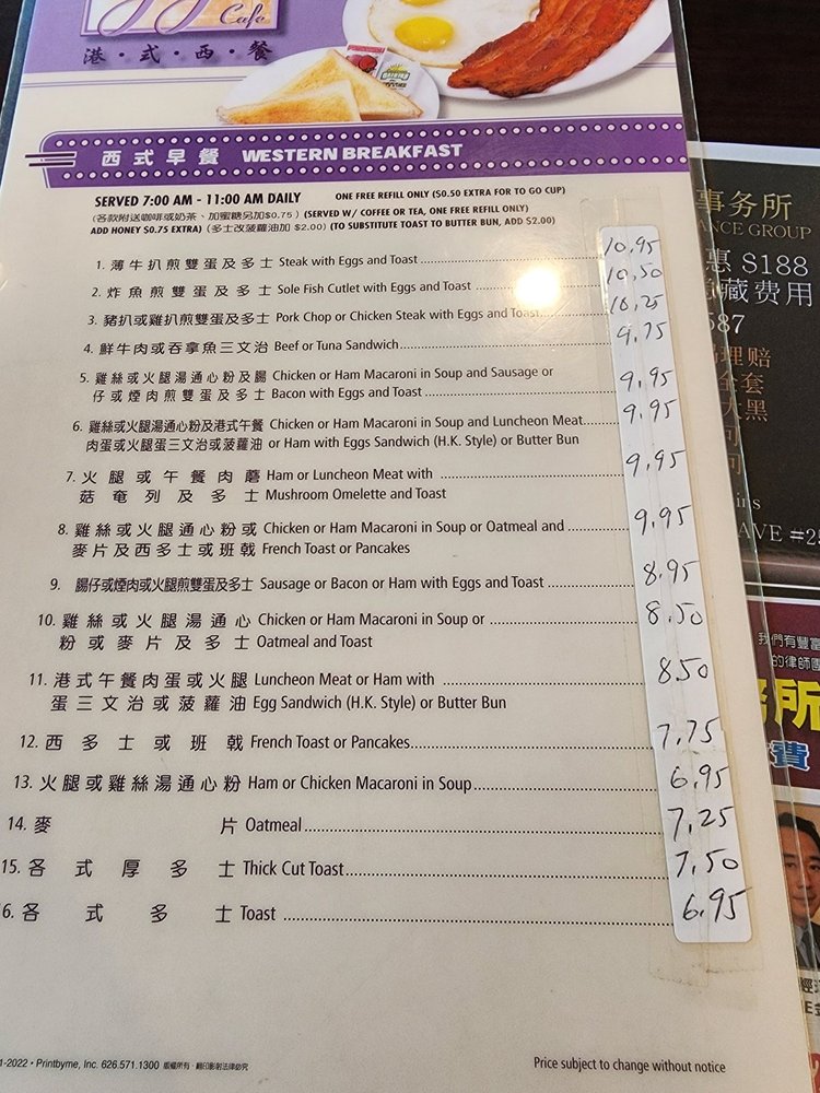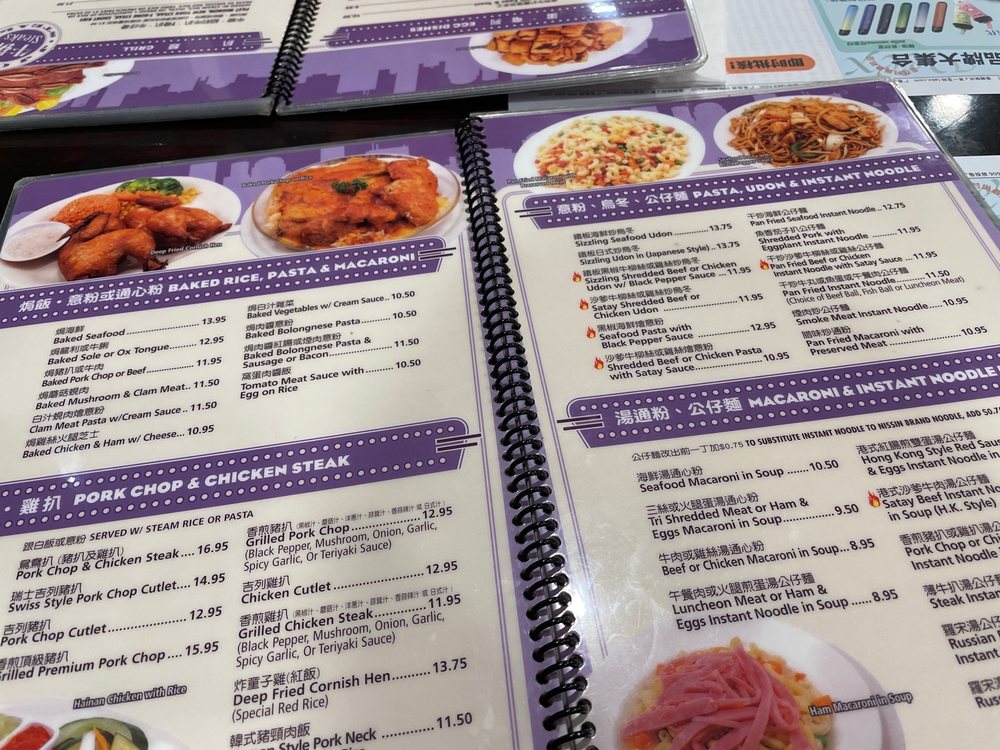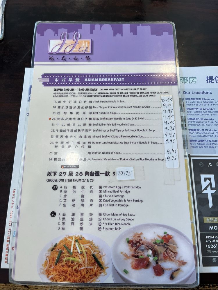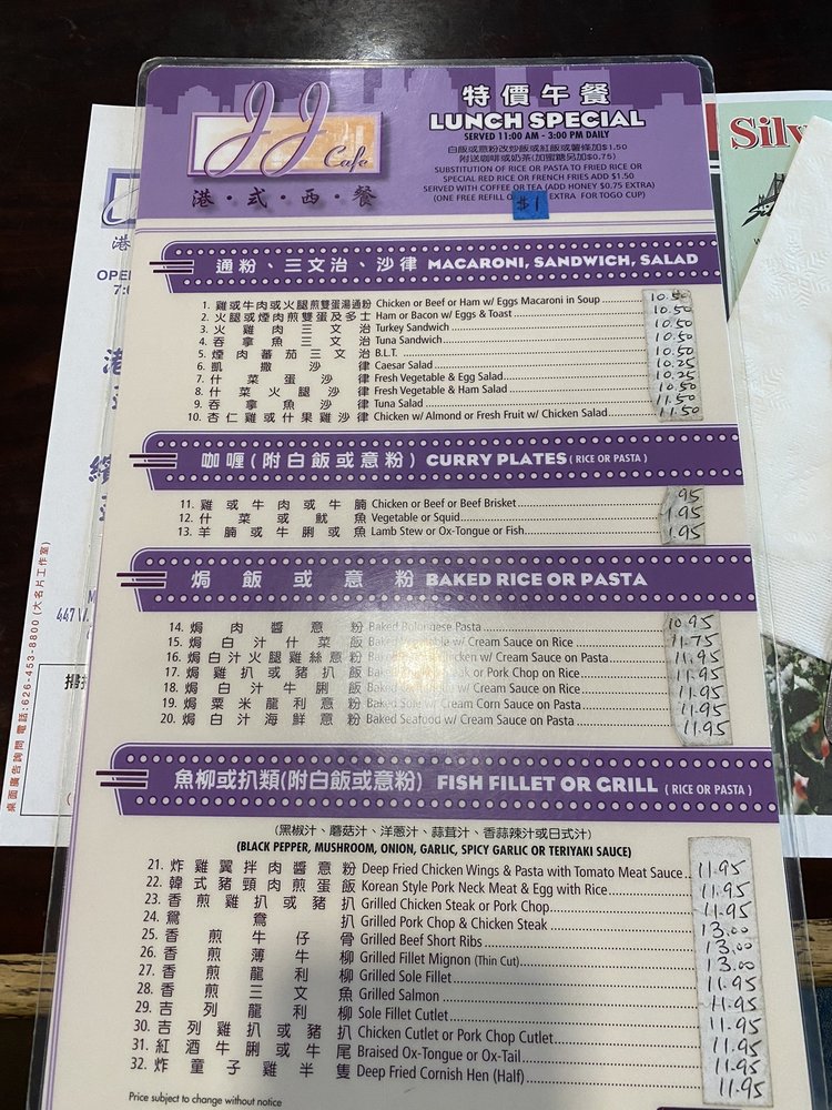 Introducing the menu at JJ Hong Kong Cafe, a nostalgic and wallet-friendly Hong Kong style diner located in Monterey Park, CA. This casual restaurant offers a diverse menu with options for vegetarians and vegans. Customers enjoy dishes like black pepper steak, Hainan chicken, kung pao 3 ingredients, and seafood pasta/rice. The traditional Cantonese style breakfast and American fusion breakfast are also popular choices. The cafe is known for its free drink refills on iced tea and Thai tea, as well as its delicious Hong Kong milk tea. For a comforting and satisfying dining experience, JJ Hong Kong Cafe is a go-to spot with a warm ambiance and consistent, flavorful dishes that hit the spot every time. Whether you're looking for a nostalgic meal or a neighborhood favorite, JJ Hong Kong Cafe delivers on taste and value.